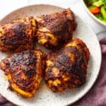 Store any leftover chicken thighs in an airtight container in the refrigerator for up to 3 days. Reheat in the air fryer at 350°F for 5-7 minutes to retain crispiness. Avoid microwaving as it can make the skin soggy.