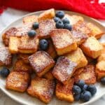 - Serve: Serve the French toast bites warm, optionally dusted with powdered sugar and accompanied by maple syrup and/or fresh fruit for added flavor and presentation.