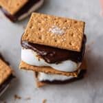 - Assemble S’mores: Place one toasted marshmallow on top of each chocolate-covered graham cracker. Sprinkle a tiny pinch (⅛ tsp) of flaky sea salt on top of the chocolate for a subtle salty contrast.