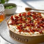 This elegant Baked Brie with Fig Jam and Prosciutto is a perfect appetizer for gatherings. Creamy brie cheese is scored and filled with a spiced fig jam mixture, topped with savory prosciutto, then baked until golden and melty. Drizzled with honey and garnished with fresh chives, it offers a harmonious blend of sweet, smoky, and salty flavors.