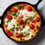 A delicious and vibrant baked feta eggs recipe featuring juicy cherry tomatoes, creamy feta cheese, white beans, and flavorful herbs, topped with perfectly baked eggs. This comforting Mediterranean-inspired dish is ideal for breakfast, brunch, or a light dinner, served with crusty bread or pita for dipping.