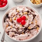 This Banana Split Fluff Salad is a creamy, fruity dessert salad that combines the classic flavors of a banana split into a light and fluffy treat. It features a mix of whipped topping, cherry pie filling, sweetened condensed milk, sour cream, marshmallows, pineapple chunks, bananas, walnuts, maraschino cherries, and mini chocolate chips, all chilled to perfection and garnished with chocolate sundae syrup for an irresistible finish.