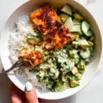 Bang Bang Salmon with Avocado Cucumber Salsa is a flavorful, easy-to-make baked salmon dish featuring a spicy-sweet bang bang sauce that complements the richness of the fish. Baked to perfection with a caramelized top under the broiler, this recipe is served over rice and paired with a refreshing avocado cucumber salsa, making for a vibrant and satisfying meal.