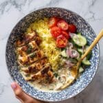 A vibrant and flavorful Banza Chicken Bowl featuring a fresh tomato and cucumber salad, creamy Calabrian chili sauce, and protein-packed air fryer chicken served over savory Banza rice. This dish offers a perfect balance of spicy, tangy, and fresh flavors with a nutritious twist using chickpea-based Banza rice and a creamy, zesty sauce.