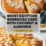 - Serve: Serve directly from the pan or loosen the edges with a knife and invert onto a serving plate. Garnish the top with shredded coconut or coconut chips and sliced almonds. Cut into 8 slices and enjoy your rich, moist Basbousa.