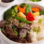 This Beef with Garlic Sauce recipe features tender thinly sliced flank steak cooked in a flavorful garlic-ginger sauce accented with soy, honey, and rice wine vinegar. The quick stir-fry method creates a deliciously savory and slightly sweet dish perfect for serving over rice with vegetables.