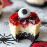 Keywords: Halloween cheesecake, Oreo cheesecake, mini cheesecakes, spooky dessert, raspberry sauce dessert, candy eye treat