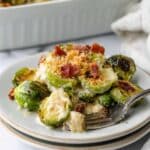 Keywords: Brussels sprout casserole, cheesy Brussels sprouts, baked Brussels sprouts, bacon casserole, Thanksgiving side dishes, holiday side dish