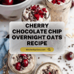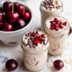 A delicious and easy-to-make cherry overnight oats recipe featuring rolled oats soaked in milk, Greek yogurt, chia seeds, honey, vanilla, mini chocolate chips, and fresh cherries. Perfect for a nutritious and ready-to-eat breakfast that can be prepared the night before.
