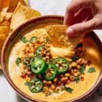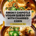 This Chipotle Vegan Queso is a creamy, smoky, and flavorful plant-based dip made from blended cashews and smoky chipotle peppers in adobo sauce. It’s seasoned with savory spices and nutritional yeast for a cheesy flavor without dairy. Topped with charred corn, jalapeño slices, and fresh cilantro, this dip is perfect for serving with crunchy tortilla chips at gatherings or for a tasty snack.