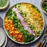 - Top and garnish: Arrange the remaining corn, radishes, avocado, scallions, Cotija, and cilantro on top of the tossed salad either scattered or in neat stripes or piles for visual appeal.