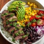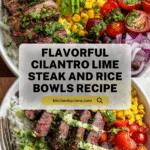 These Cilantro Lime Steak and Rice Bowls combine tender, marinated flank steak with zesty lime, fresh cilantro, and a flavorful crema, served over a base of fluffy white rice, black beans, and sweet corn. This vibrant and nutritious bowl is perfect for a quick dinner that feels like a celebration of fresh, bold flavors.