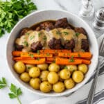 This classic pot roast recipe features a tender, slow-cooked chuck roast simmered with aromatic herbs, red wine, and beef broth, accompanied by hearty baby potatoes, carrots, celery, and onions. Cooked low and slow in the oven, this comforting meal perfectly balances rich flavors and melt-in-your-mouth textures, ideal for a cozy family dinner.
