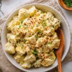 Store the potato salad in an airtight container in the refrigerator for up to 3 days. Stir gently before serving. It’s best enjoyed chilled but can be served at room temperature as well. Avoid leaving it out for more than two hours to ensure freshness and food safety.