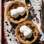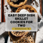 A quick and easy recipe for Deep Dish Skillet Cookies for Two, featuring a rich almond butter dough with dairy-free chocolate chips baked in ramekins. Perfectly portioned for a cozy dessert paired with dairy-free vanilla ice cream.