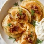 - Serve or Fry: Garnish pierogis with remaining caramelized onions and fresh dill. Serve warm with sour cream and applesauce. Optionally, melt 1 tablespoon butter in a skillet over medium heat, add boiled pierogis in a single layer, and fry until golden brown on both sides, about 4 minutes total.