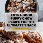 This Extra Good Puppy Chow recipe is a delightful sweet snack made by coating crispy rice Chex cereal with a rich blend of melted chocolate, peanut butter, and butter, then dusted with powdered sugar for a perfect balance of flavors and textures. Known for its irresistible crunch and sweet, nutty taste, it’s ideal for parties, snacking, or gifting.