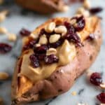 A simple and nutritious fall-inspired recipe featuring baked sweet potatoes stuffed with creamy peanut butter, tart cranberries, crunchy toasted nuts, and a warm touch of pumpkin pie spice. Perfect for a quick breakfast or wholesome snack.