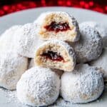 Deliciously delicate Almond Snowball Cookies filled with raspberry jam and coated in powdered sugar. These buttery treats combine the nutty flavor of toasted ground almonds with a sweet and tangy surprise in the center, perfect for festive occasions or an everyday indulgence.