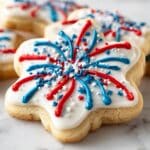 Firework Cookies are festive sugar cookies decorated with vibrant red and blue royal icing bursts. Crispy on the edges and soft inside, these cookies are perfect for celebrations and sure to impress with their fun, colorful designs.