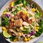 - Step 6: To assemble the bowls, divide the chopped romaine evenly among serving bowls. Top with a generous helping of the spicy slaw, several pieces of the crispy fish, chopped avocado, sliced mango, fresh cilantro leaves, and a drizzle of the spicy crema. Serve immediately with lime wedges on the side.