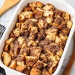 While it’s best when prepared overnight to let the bread soak fully, you can assemble and bake it immediately. It may require a slightly longer baking time and won’t be quite as custardy.