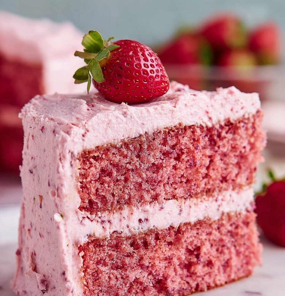 A delightful Fresh Strawberry Cake featuring a moist strawberry-infused cake layered with luscious strawberry buttercream frosting, made with fresh strawberries, strawberry reduction, and a perfect balance of lemon and vanilla flavors. Ideal for spring and summer celebrations.