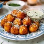 - Serve: Arrange the golden, seasoned potato balls on a serving platter. Generously top with freshly grated Parmesan and chopped chives. Serve alongside the prepared dill and chive dipping sauce. Enjoy warm.