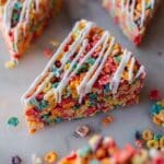 Fruity Pebbles Treats are a bright and chewy twist on classic rice cereal treats, bursting with fruity flavor and a sweet almond bark drizzle. They’re perfect for a fun dessert or a colorful party snack that everyone will love.