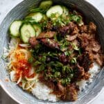 Garlic and Black Pepper Beef Skewers are a flavorful and quick-to-make dish featuring tender skirt steak strips marinated in a savory mixture of garlic, ginger, soy, and curry powder, then broiled to caramelized perfection. Served with fresh toppings like fish sauce, lime juice, chili crisp, and cilantro, these skewers are perfect for a delicious rice bowl or a light side salad.