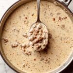 - Step 8: Whisk in milk, 1/4 teaspoon kosher salt, and 1/2 teaspoon black pepper. Continue simmering, whisking occasionally, until the gravy coats the back of a spoon and drips slowly, about 2 to 3 minutes.