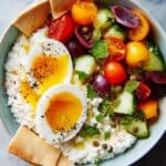 This Greek Salad Cottage Cheese Bowl is a fresh and vibrant meal perfect for a light lunch or snack. It combines halved cherry tomatoes, Persian cucumbers, bell pepper, Kalamata olives, and capers with the bold flavors of za’atar and lemon juice. Topped with protein-rich low-fat cottage cheese and boiled eggs, and served with whole grain pita chips, this recipe offers a nutritious and satisfying Mediterranean-inspired dish that’s quick and easy to prepare.
