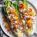 This Grilled Romaine Salad features crisp romaine lettuce charred to perfection and topped with crunchy garlic butter croutons, fresh radishes, carrot ribbons, grape tomatoes, and a creamy tangy lemon dressing made from Greek yogurt, olive oil, and parmesan cheese. A light, refreshing salad perfect as a starter or a side dish.
