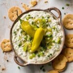 - Serve and Garnish: Before serving, top the dip with additional diced pepperoncinis and green onions for extra flavor and presentation. Pair with your favorite dippers such as chips, pretzels, crackers, or fresh vegetables.