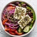 Keywords: Horiatiki Salad, Greek Salad, Mediterranean Salad, Feta Salad, No Cook Salad, Healthy Salad, Vegetarian, Gluten Free