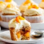 - Frost and finish: Pipe or dollop vanilla buttercream on top of each cupcake, then spoon reserved peach filling on top to finish.