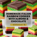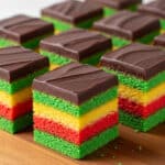 Classic Italian Rainbow Cookies are a vibrant and delicious layered almond-flavored treat featuring colorful sponge cakes layered with apricot and raspberry preserves, then coated in tempered semisweet chocolate. These festive cookies are perfect for holidays or special occasions, combining a tender yet firm texture with the perfect balance of fruit and chocolate.