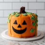 This Jack-O’Lantern Halloween Cake is a festive and delicious chocolate Bundt cake designed to resemble a pumpkin, perfect for Halloween celebrations. Made from rich, moist chocolate layers filled and frosted with vibrant orange American buttercream, it features a creative carved face filled with black frosting, a chocolate stalk, and piped green vines and leaves for a spooky yet elegant finish. The recipe yields two large Bundt cakes stacked and decorated to create a stunning centerpiece dessert.