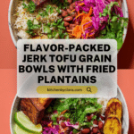 Keywords: Jerk tofu, plant-based, vegan bowls, Caribbean cuisine, tofu marinade, fried plantains, rice and peas, cabbage slaw, spicy tofu, healthy dinner