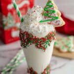 - Pour and Garnish: Pour the creamy milkshake into the sprinkle-rimmed glass. Top with a generous swirl of Cool Whip using a piping bag with a star tip. Sprinkle extra red and green sprinkles on top, and finish by placing one whole Christmas Tree Cake as a festive garnish on the whipped topping.