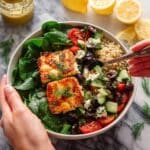 This Mediterranean Brown Rice Salad is a vibrant and healthy dish perfect for lunch or as a side. Packed with fresh vegetables, herbs, and a zesty lemon dressing, it offers a delightful mix of flavors and textures. Adding crispy halloumi on top makes it an irresistible meal.