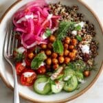 This vibrant Mediterranean Quinoa Bowl features a nutritious base of fluffy quinoa topped with smoky roasted chickpeas, fresh Persian cucumbers, cherry tomatoes, creamy avocado, tangy pickled red onions, and fragrant herbs. Finished with a drizzle of garlicky yogurt sauce and a sprinkle of Aleppo pepper, this bowl offers a delightful balance of textures and flavors, making it a perfect healthy lunch or dinner option.