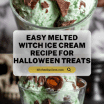 Melted Witch Ice Cream is a festive and fun treat perfect for Halloween or any spooky occasion. This creamy mint chocolate chip ice cream features crunchy chocolate pieces and adorable mini witch hat cookies for a whimsical touch.