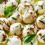 Merry Mozzarella Bites are a simple, vibrant appetizer featuring cilingine cheese tossed in a flavorful mixture of extra-virgin olive oil, fresh herbs, white balsamic vinegar, and a touch of crushed red pepper for a gentle kick. Perfect for holiday gatherings or anytime you want an easy, elegant starter.