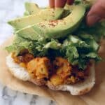 - Assemble the sandwich: Place the bottom half of the sliced bread roll on baking paper or tin foil. Spoon a generous amount of the chorizo and potato filling onto the bread, then add shredded lettuce, sliced avocado, and the cheese mixture. Top with the upper half of the bread roll.