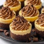 - Step 12: Pipe or spoon the whipped cream over each mini cheesecake and sprinkle with crushed chocolate covered espresso beans if using.