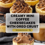 Keywords: mini cheesecake, coffee cheesecake, Oreo crust, coffee dessert, individual cheesecakes, whipped cream topping, espresso beans