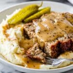 - Serve: Slice the meatloaf and serve hot with mashed potatoes or egg noodles, drizzling the gravy on top.