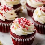 These Most Amazing Red Velvet Cupcakes feature a moist and tender crumb with vibrant red color, complemented by a smooth and creamy Ermine icing. Perfectly baked and topped with classic Southern-style frosting, these cupcakes are a delightful treat for any occasion.