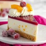 A luscious, no-bake cranberry orange cheesecake featuring a buttery graham cracker crust, a creamy orange-infused filling, a smooth cranberry topping, and sparkling sugared cranberries for garnish. This elegant dessert combines tangy citrus and tart cranberries with a rich, velvety cream cheese base, perfect for special occasions or festive gatherings.